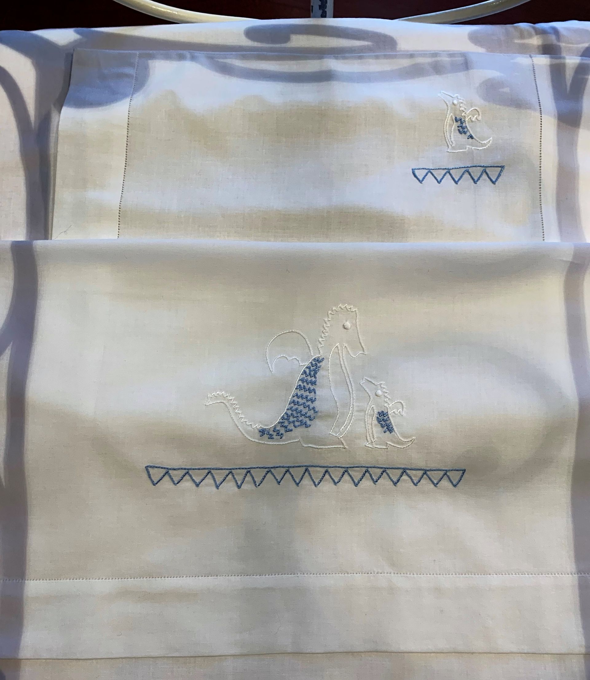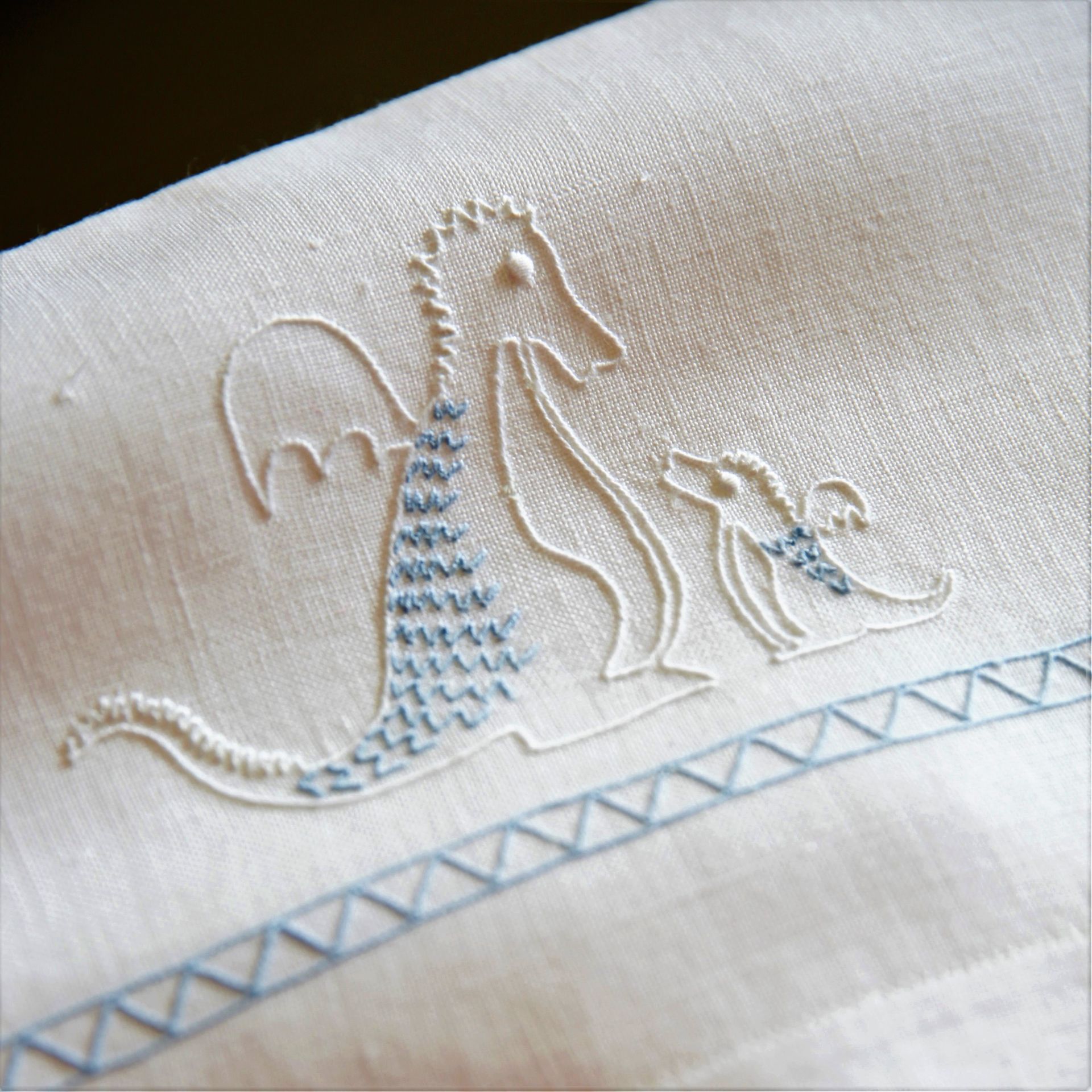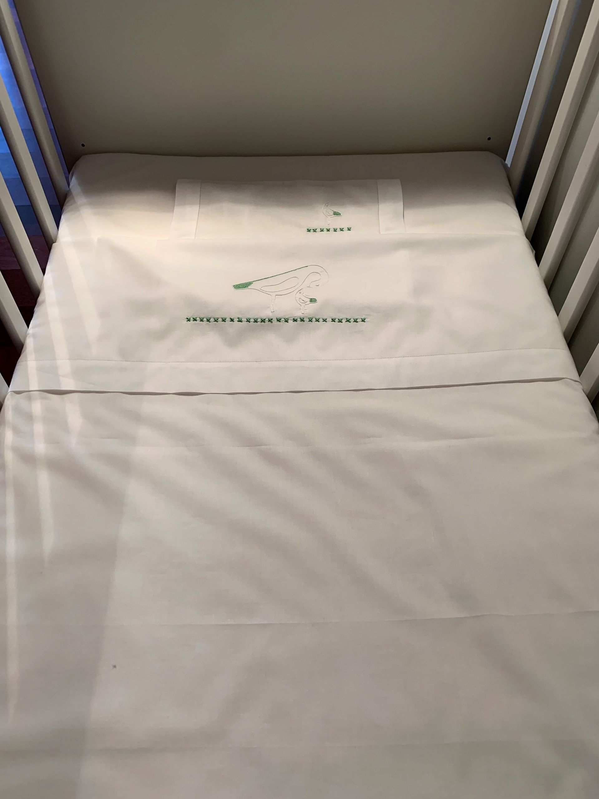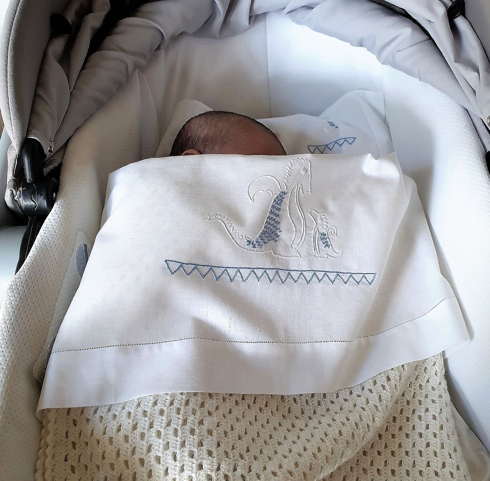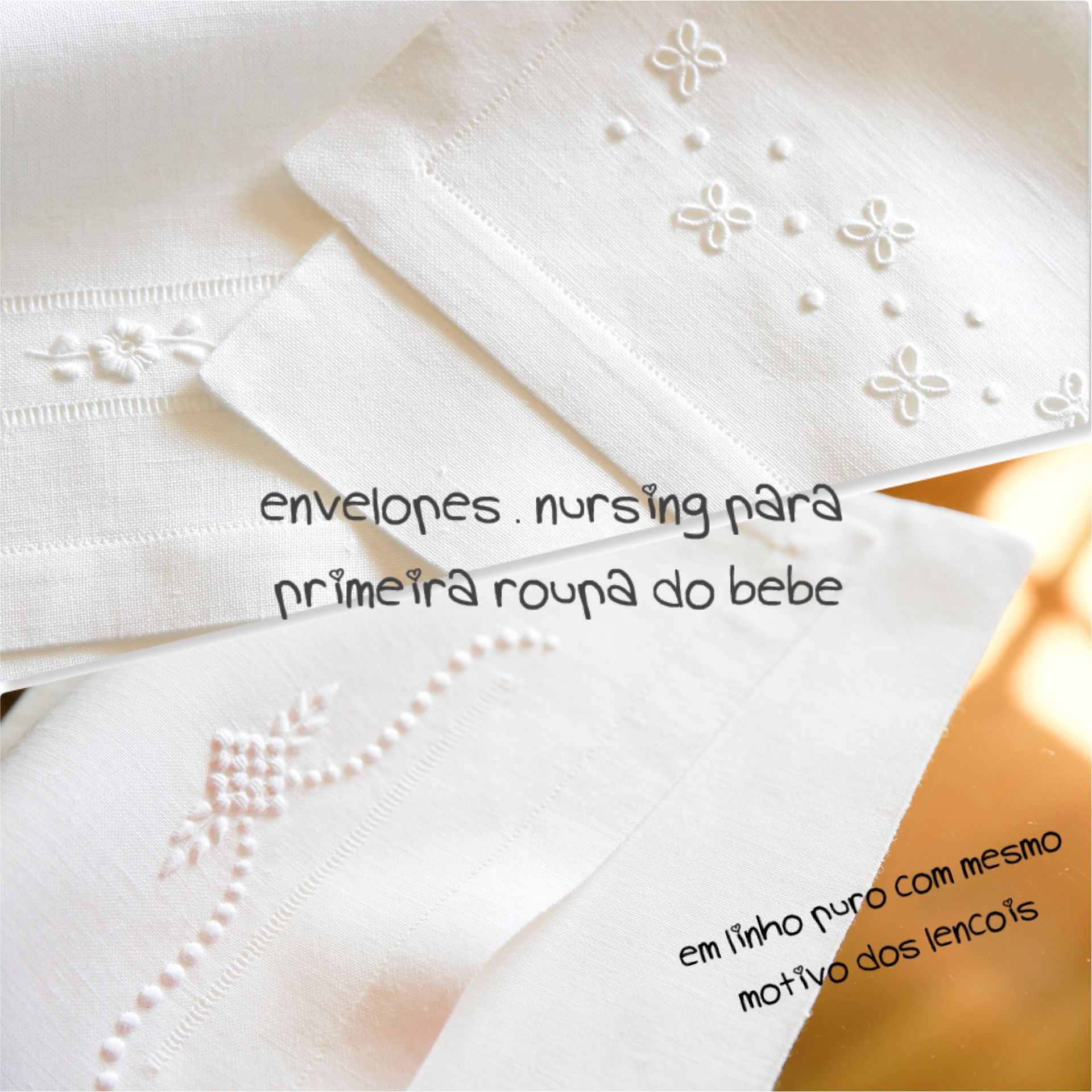 the embroidery, of incomparable beauty, rich in a variety of techniques and stitches, is done by hand, on delicate textiles, made of pure cotton, where the transparency of the lines stands out. You will also find, with the same motif, hand embroidered on pure linen, the bag to take the baby's first clothes to the maternity ward.